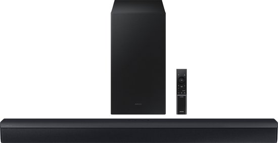 De Samsung HW-C450 Soundbar: Een meesterlijke toevoeging aan je thuisentertainmentsysteem. Ervaar een strakke kijk-en luisterervaring door middel van het meeslepende geluid. Met zijn slanke ontwerp past hij perfect bij moderne televisies. Subwoofer meegeleverd De bijgeleverde subwoofer kan draadloos worden aangesloten en zorgt voor helder en krachtig geluid op iedere plek in de kamer. Extra bas, grotere sensatie En voor wie nóg meer bas wil is er de Bass Boost-modus. Deze versterkt de diepe lage tonen voor een nog intensere kijkervaring. Verfijnd geluid voor je favoriete content Adaptive Sound Lite analyseert muzieknummers om het geluid voor jouw specifieke content te optimaliseren. Je hoort dus duidelijk, gedetailleerd geluid, ongeacht wat je kijkt. Game Mode De Game Mode geeft je een voorsprong tijdens het gamen door afleidende geluiden automatisch te elimineren en het geluid te optimaliseren om dit gericht te plaatsen.
